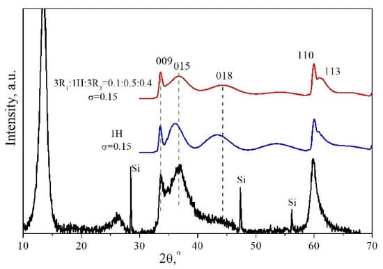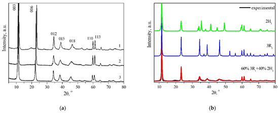 Experimental diffraction patterns of the initial MgGa-CO3 LDHs with different mole fractions of the divalent cation (Mg2+/(Mg2+ + Ga3+) = 0.67; 0.75; 0.80) show (Figure 1a) that they do not correspond to the 3R1 (AC = CB = BA = …) or 2H1 (AC = CA = …) polytype. In distinction to the diffraction patterns of the 3R1 and 2H1 polytypes, asymmetric distortions of the peak shape in the region of medium diffraction angles 2θ = 35° ÷ 45° (012, 015 and 018 peaks) are observed in the experimental diffraction patterns.