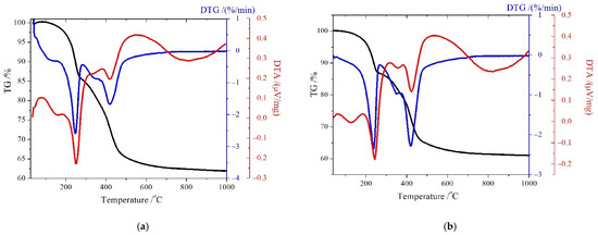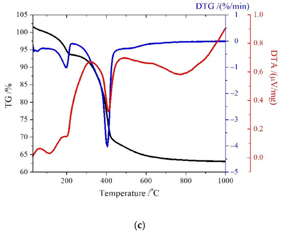 Thermal decomposition of MgGa-CO3 LDHs (Figure 2) resembles that of the carbonate-containing MgAl LDHs. The process can be divided into four steps: (1) removal of physisorbed water, (2) removal of interlayer water, (3) dehydroxylation of brucite-like layers, and (4) decarbonization of interlayers [51]. Dehydroxylation and decarbonization temperatures as well as the thermal decomposition rate depend on the mole fraction of the divalent cation. The higher is the content of the divalent cation, the earlier is the onset of the dehydration of interlayers. For a sample with the mole fraction of Mg = 0.67, one can see on the DTG curve that the decomposition rate is quite high in the first weight loss step and exceeds the decomposition rate in the second step (Figure 2a). For a sample with Mg = 0.75, a virtually similar decomposition rate is observed in both weight loss steps on the DTG curve (Figure 2b). For MgGa-CO3 DTG with the mole fractions of Mg2+ = 0.67 and 0.75, dehydroxylation and decarbonization steps start at different temperatures. An intense endothermic peak on the DTA curve at 220–420 °C corresponds to the onset of dehydroxylation of the brucite-like layers. At the same time, an increase in the Mg2+ fraction to 0.80 leads to a decrease in the decomposition rate in the first weight loss step (Figure 2c). The observed weight losses are accompanied by the appearance of three endothermic peaks on DTA curves. It means that two processes occur jointly in the second weight loss region. The first endothermic peak at 210–250 °C is associated with the dehydration of interlayers. As the mole fraction of Mg2+ increases to 0.80, this peak broadens and grows in intensity. The dehydration temperature maximum shifts toward lower temperatures with an increase in the mole fraction of Mg2+. The second endothermic peak at 330–350 °C corresponds to the partial dehydroxylation of brucite layers. When the mole fraction of Mg2+ increases, this peak shifts toward higher temperatures: at Mg2+ = 0.80, its superposition with the third peak becomes visible. The third endothermic peak with the maximum at 410–425 °C is associated with complete decomposition of the layered structure, leading to the formation of the oxide phase.