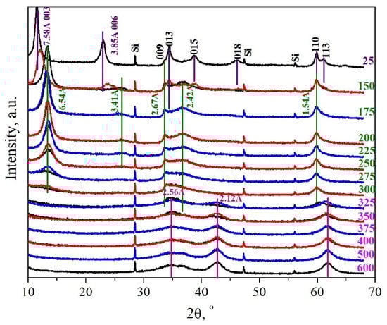 For a sample with the mole fraction of Mg2+ = 0.67, in situ high-temperature X-ray diffraction (HTXRD) was performed in the range from 25 to 600 °C (Figure 3). It was found that an increase in the temperature up to 150 °C produces virtually no changes in the diffraction pattern. At 175 °C, peaks of the initial hydroxide (purple lines) decrease in intensity, and there appear the peaks of another phase with a decreased interlayer distance, which is equal to d003 in hydrotalcite (3R1 polytype). The interlayer distance decreases from 7.58 Å to 6.54 Å, and the interplanar distance d006 = d003/2 decreases from 3.85 Å to 3.41 Å. In the medium angular range, 013, 015, and 018 peaks decrease in intensity and a narrow peak with the interplanar distance d = 2.67 Å and a broad peak with d = 2.42 Å appear. At 200 °C there remain only the peaks corresponding to the new phase (olive lines). In the range of high angles, one asymmetric peak with d = 1.54 Å remains instead of hydrotalcite peaks 110 and 113. According to thermal analysis data, approximately at this temperature the dehydration of interlayers is observed. This is why the new metastable phase is commonly called the dehydrated LDH phase [52]. A further heating to 300 °C decreases the intensity of the peak corresponding to d = 6.54 Å. Low-intensity peaks of the dehydrated phase (hereinafter denoted as MgGa-dehydrat) can be observed up to a temperature of ca. 350 °C, at which peaks of the oxide phase with interplanar distances d = 2.12 and 1.50 Å become the main ones (pink lines).