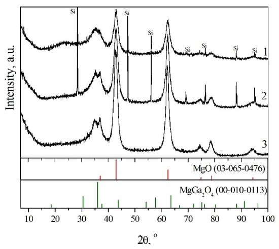 XRD patterns of calcined MgGa LDHs (T = 550 °C) with different mole fraction of Mg2+ (1—0.67; 2—0.75; 3—0.80).