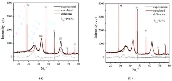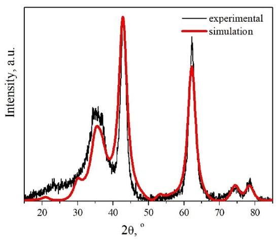 The Rietveld refinement (Figure 6b) performed for the indicated model showed that the intensity ratio of diffraction peaks 200 and 220 is closer to the experimental ratio. One can see also that the broad peak at ca. 35° is described by this structure.