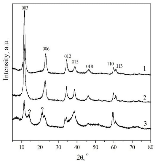 XRD patterns of MgGa-OH LDHs with different mole fraction of Mg2+ (1)—0.67; (2)—0.75; (3)—0.80.