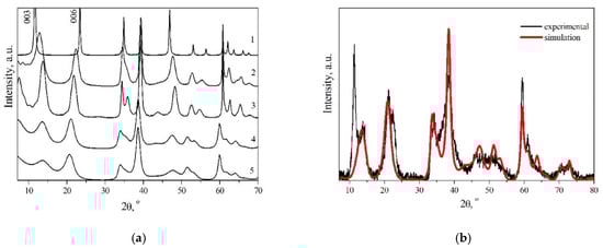 The diffraction patterns were calculated within the model of hydrotalcite structure (3R1 polytype) with a gradual introduction of brucite layers (Figure 9a).