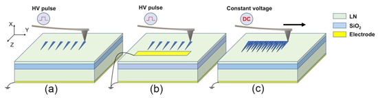 Schemes of the poling setups for (a) isolated domains and periodical poling, (b) domain switching toward the stripe electrode, and (c) creation of comb-like domains.
