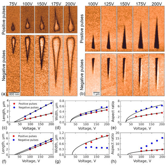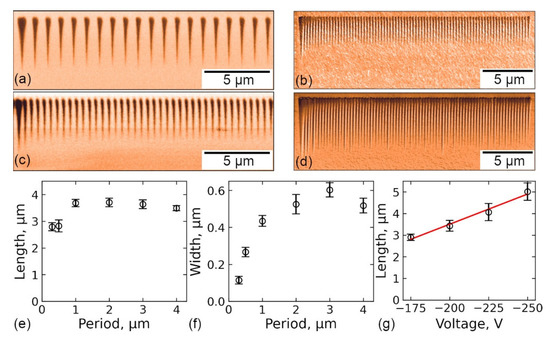 We obtained a uniform domain length for the entire range of periods from 4 to 0.3 µm (Figure 5a–c). The width of the domain increased over the period, while the aspect ratio essentially decreased from 25 to 7 (Figure 5e,f). The domain length increased linearly with voltage (Figure 5g). The variation in domain lengths was obtained for the 300 nm period, switched at voltages above −200 V (Figure 5d,g). It is necessary to point out that the achieved domain length above 3 μm is sufficient for LN waveguides with a width of around 1 μm.