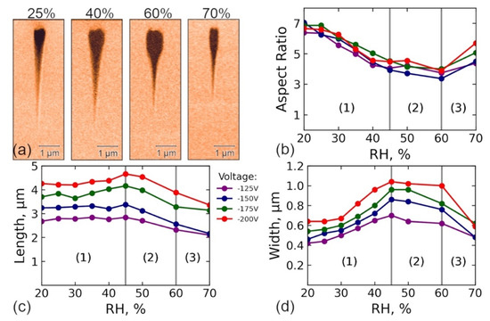 The influence of humidity on domain growth was studied at an RH ranging from 20% to 70%, with pulses of −125 V to −200 V and a duration of 1 s (Figure 3). Three RH regions, characterized by different domain shapes, were distinguished.