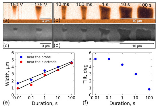 Domain growth toward the grounded stripe electrode. (a,b) PFM and (c,d) SEM images of domains created by pulses with various (a,c) voltages (pulse duration 1 s) and (b,d) pulse durations (voltage was −175 V). Dependences of the (e) domain width and (f) domain wall tilt on pulse duration.
