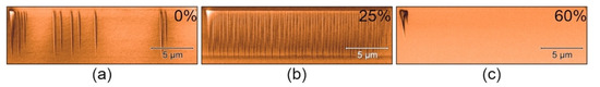 The self-organized domain structures were formed during scanning with a biased tip along the Y axis with a voltage of −175 V and scanning rate of 5 µm/s at various levels of RH (Figure 6). The strongly pronounced dependence of the domain structure on RH was revealed. Only a few isolated narrow domains appeared in dry nitrogen and at an RH of 60% (Figure 6a,c). Self-organized “comb-like” structures, consisting of narrow domains, were formed at a humidity of around 25% (Figure 6b). A similar effect had been previously obtained on nonpolar cuts of bulk LN [54].