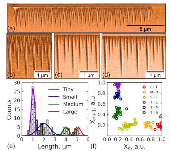 The effect of self-organization can be clearly observed in a histogram (Figure 7e) and Poincaré plot, which represents the dependence of the length of each domain in the array on the length of its neighbor (Figure 7f). An analysis of the Poincaré plot revealed the formation of six separated clusters, corresponding to four groups of domains, which can also be clearly distinguished in the histogram: L—large; M—medium; S—short; and T—tiny. The formation of quasiperiodic alternations of domain length, such as four- (L-T-S-T-…) (Figure 7b) and eight-fold (L-T-S-T-M-T-S-T…) period increases (Figure 7c), was observed. Arrays with chaotic alternation were also obtained (Figure 7d).