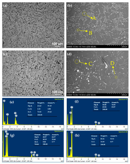 Figure 2 shows the microstructures and SEM/EDS of the homogenized TXC311 and TXCZ3111 alloys. The average grain size of the TXC311 alloy is 449 μm, and the black second phases are well-distributed. After the addition of 1% Zn element, the grain size is obviously refined, and the average grain size is about 286 μm, while the microstructures show equiaxed grain. With the addition of 1% Zn, the amount of the second phase decreases obviously, as shown in the SEM images. Moreover, energy spectrum results show that the second phase of the TXC311 alloy is composed of strip CaMgSn phase (point A) and spherical Mg2Cu phase (as shown at point B). A small amount of needle-like MgZnCu phase (as shown at point D) is formed in the TXCZ3111 alloy, and the content of Mg2Cu phases decreases. The formation of MgZnCu phase consumes Cu elements in the alloy, resulting in the reduction of Mg2Cu phase. A large number of CaMgSn phases are distributed in both alloys, which is mainly related to the Sn/Ca mass ratio. When the Sn/Ca mass ratio is close to 3, CaMgSn phases mainly exist in TX31 alloys [18].