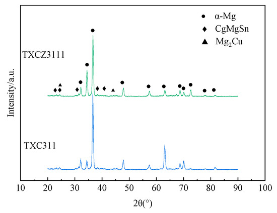 Figure 3 shows the X-ray diffraction (XRD) of TXC311 and TXCZ3111 alloys. It can be seen that both the TXC311 alloy and TXCZ3111 alloy have CaMgSn and Mg2Cu phases. However, no MgZnCu phase was detected in the TXCZ3111 alloy because its amount is so low.