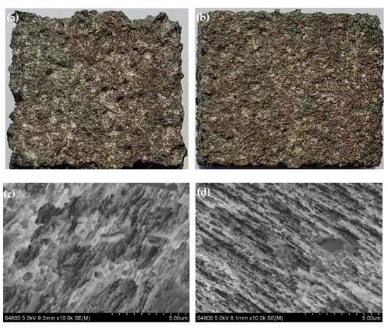 Macroscopic and SEM images of homogeneous TXC311 and TXCZ3111 alloys. (a,c) TXC311; (b,d) TXCZ3111.