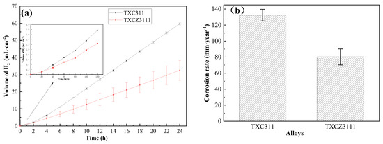 Corrosion of homogenized TXC311 and TXCZ3111 alloys by immersion for 24 h. (a) Volume of H2; (b) corrosion rate.