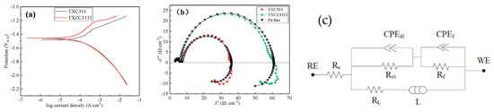 (a) Polarization curves; (b) Nyquist plots; (c) Fitting circuit.