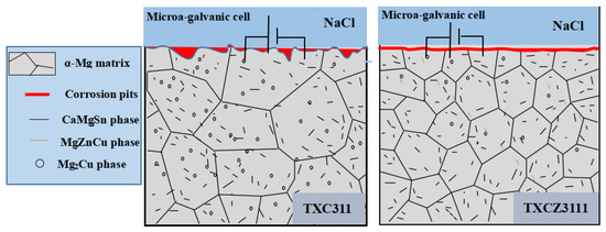 The corrosion resistance of magnesium alloy is mainly attributable to grain size, the homogeneity of microstructure and defect density [24]. The results show that smaller grain size can improve corrosion resistance. In addition, second-phase particles also play an important role in the corrosion behavior of magnesium alloys. In general, the self-corrosion potential of the second-phase particles is higher than that of the magnesium matrix [2,25]. Therefore, when the magnesium alloy is immersed in 3.5 wt.% NaCl solution, the second phase usually acts as a micro-cathode. Galvanic corrosion occurs between the second phase and the magnesium matrix, resulting in rapid corrosion of the magnesium matrix around the second phase [26]. The corrosion mechanism of TXC311 and TXCZ3111 alloys is shown in Figure 7. The grain size of the TXCZ3111 alloy (286 μm) is obviously smaller than that of the TXC311 alloy (449 μm), and more grain boundaries can reduce the corrosion rate of the alloy in a physical shielding role. Secondly, the subsequence of corrosion resistance ability is as follows: CaMgSn > MgZnCu > Mg2Cu. Meanwhile, the Mg2Cu phase has a higher potential (−1.69 V) than that of α-Mg. Therefore, the Mg2Cu phase and α-Mg, as cathodes and anodes, respectively, accelerate the corrosion of alloys through the process of micro-galvanic corrosion [27]. Therefore, the corrosion resistance of the TXC311 alloy is poor due to its large number of Mg2Cu phases. After adding Zn elements, the volume fraction of the second phase is significantly reduced. MgZnCu phases can decrease the number of Mg2Cu phases, which improves the corrosion resistance of the alloy [28].
