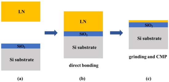 Fabrication process of grinded LNOI. (a) A layer of SiO2 was grown on an Si substrate. (b) Si substrate and LN were directly bonded. (c) LN crystal was grinded and polished.
