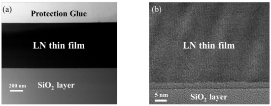 Cross section of grinded LNOI observed by TEM (a) and high-magnification TEM (b).