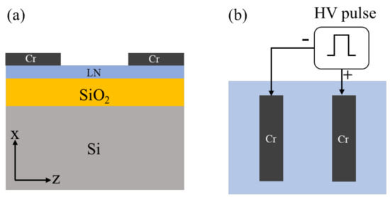 Cross section of Cr on x-cut LNOI (a) and scheme of domain polarization inversion configuration (b).