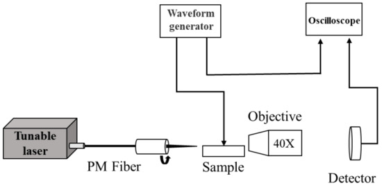 where V is the voltage applied to the electrode, Eele is the electrostatic field, and Eopt is the optical field. The measurement setup is shown in Figure 4. Polarized light with a wavelength of 1550 nm was emitted from a tunable semiconductor laser (Santec TSL-210). The laser beam was coupled into the waveguide by a polarization-maintaining (PM) fiber, and the output light was collected by a 40×/0.65 objective lens and displayed in an oscilloscope by an InGaAs detector. The electrical signal from the waveform generator was applied to the electrode to modulate the light signal in the waveguide. The electrostatic field (Eele) and optical field (Eopt) were simulated by Charge Solutions and Mode Solutions, respectively.