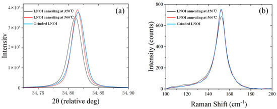 Figure 5a shows the diffraction peaks of the (110) crystal planes of the LNOI as measured by HRXRD. The black line from LNOI annealing at 350 °C had a diffraction peak of 34.809° and a FWHM of 0.026°. The red line from LNOI annealing at 500 °C had a diffraction peak of 34.815° and a FWHM of 0.026°. The blue line from grinded LNOI had a diffraction peak of 34.817° and a FWHM of 0.027°. The FWHMs were small, showing that the LNOI was mono-crystalline with an ordered crystal-lattice arrangement. The FWHM of LNOIs did not show significant differences. To study the lattice structure after undergoing the ion implantation process, Figure 5b shows the polarized Raman spectra of the LNOI at 153 cm−1 with an X(YZ)X scattering configuration. The blue line from the grinded LNOI had a FWHM of 9.41 cm−1. The black line from the LNOI annealing at 350 °C had a FWHM of 10.75 cm−1, which was broadened, potentially due to the disorder of the crystal lattice. The red line from the LNOI annealing at 500 °C had a FWHM of 9.41 cm−1. The FWHM of LNOI annealing at 500 °C was consistent with that of grinded LNOI, revealing that the crystal lattice of the LN thin film was well recovered without causing an expansion of the frequency range of the lattice vibration.