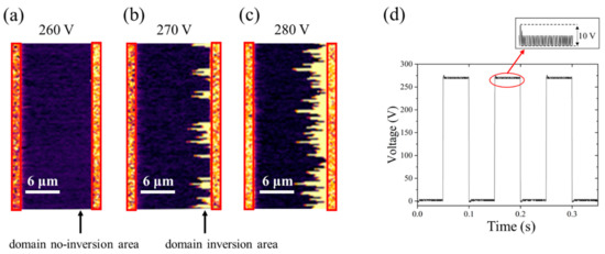 Domain inversion images of LNOI annealing at 350 °C at 260 V (a), 270 V (b) and 280 V (c). Electrical pulse waveform when the voltage was 270 V (d).
