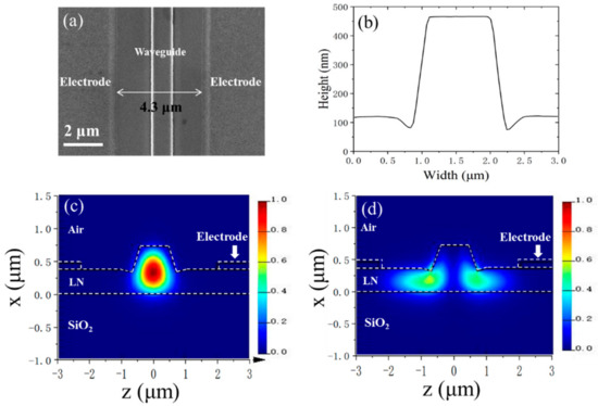 Figure 7a shows a scanning electron microscope (SEM) image of the phase modulator in grinded LNOI. The gap and length of the electrodes were 4.3 μm and 5 mm, respectively. Figure 7b shows an atomic force microscope (AFM) image of the LNOI waveguide cross-section. The rib had a top width of 0.9 µm and a bottom width of 1.4 µm. The LN etch depth was 350 nm, leaving a 370 nm slab (measured by the white light interferometry method). Figure 7c,d show the profiles of the TE00 and TE10 mode at 1550 nm. When the gap of the electrodes was 4.3 μm, the transmission losses of the TE00 and TE10 mode were simulated to be 0.5 and 520 dB/cm, respectively. Owing to the high transmission loss of the TE10 mode, the waveguide could be considered to be single-mode transmission. Figure 8a,c show the electric fields Ez and Ex, respectively, of the TE00 mode. Figure 8b,d show the electric fields Ez and Ex, respectively, of the electrostatic field after a voltage of 1 V was applied to the electrodes. Because the overlapping factors Γ of the Ex of the TE00 mode and the Ex of the electrostatic field were almost 0, their contribution to the phase change of the TE00 mode can be ignored. The overlapping factors Γ of the Ez of the TE00 mode and the Ez of the electrostatic field were 0.53.