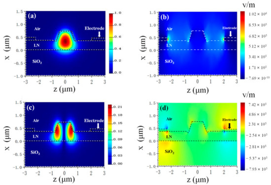 Electric field Ez (a) and Ex (c) distributions of the TE00 mode. Electric field Ez (b) and electric field Ex (d) distributions of the electrostatic field after 1 V voltage was applied to the electrodes.