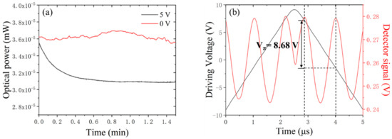 Figure 9a shows the variation of output light power with time after applying volt-ages of 5 and 0 V on the electrodes. When the voltage was 0 V, the output light power was stable with time; when the voltage was 5 V, the output light power varied significantly with time. The light power variation was related to the DC bias drift, which resulted from the flow and redistribution of electrical charge in the LN region under DC voltage [26]. This phenomenon would cause uncertainties in the measurement of Vπ. Triangular waves (200 kHz with an amplitude of 18 V) were used to minimize the influence of the DC bias drift. Figure 9b shows the measured light transmission at 1550 nm. The red and black lines represent the triangular wave electrical and optical signals, respectively, indicating a Vπ of 8.68 V. The uncertainty of the E-O coefficient mainly results from two aspects. One was the overlapping factor calculation error caused by the uneven morphologies of the waveguide and electrodes. The other was Vπ measurement error. The uncertainty of the E-O coefficient was estimated to be within 3%. The E-O coefficient of ground LNOI was 27.3 ± 0.4 pm/V, which was close to that of LN bulk materials (28.6 pm/V [27]). The stress at the interface between LN thin film and SiO2 might cause the E-O coefficient of LNOI to be smaller than that of LN bulk material [28]. As shown in Table 2, using the same method, the E-O coefficient of LNOI annealing at 350 °C was 26.1 ± 0.4 pm/V, which was lower than grinded LNOI. This might be due to lattice damage caused by ion implantation.