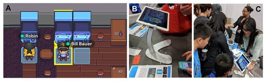 XFEL Crystal Blaster Outreach and Implementation—(A) the game was integrated into an arcade object within the virtual gather.town world used in several online events; (B) students at the USA Science and Engineering Expo play XFEL Crystal Blaster and download it to their own devices; (C) BioXFEL Scholars Frances Heredia Negron and Elaina Flores teach students about the science of BioXFEL and demonstrate how to play the game.