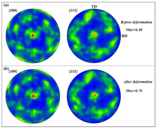 - The initial texture is strong before compression, and then the volume fraction of {111}<uvw> orientations increases from 34.7% to 36.5%, while the volume fraction of {100}<uvw> orientations increases from 25.5% to 26.7% after compression;