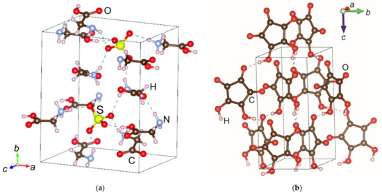 (a) TSG:CA (90:10) and (b) CA crystal structures. For TSG:CA structure (a) see space group and unit cell parameters in Table 1. The sizes of the voids in the TSG-like structure are ~0.6 × 1.1 nm. CA crystal structure (b) is characterized by the space group Pca21 (29) and unit cell parameters a = 8.7108 Å, b = 5.1683 Å, c = 10.9562 Å [37]. The maximum size of CA molecules is ~0.5 nm.