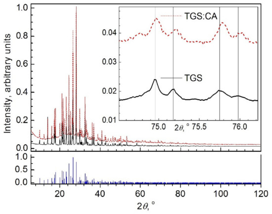 Normalized XRD patterns of TGS and TGS:CA (90:10) powders. The inset illustrates the shift in the positions of the TGS:CA reflections in comparison with the TGS. Below is a theoretical diagram of independent reflections shown by vertical bars. The angular position and the relative intensity of the reflections are calculated theoretically from the structural model [62]. The height of each line is proportional to the theoretical relative intensity of the corresponding reflection.