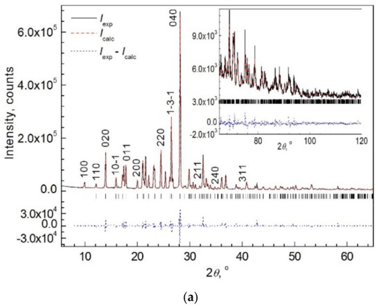 The satisfactory quality of the Rietveld fit is illustrated graphically in Figure 4. Despite the fact that the atomic coordinates of the starting structural models were not refined, the achieved agreement factors (weight profile Rwp and profile Rp factors as well as the profile weight profile cRwp and cRp factors after subtracting the background contribution, and the agreement Bragg factors RB, reflecting the consistency of the structure and model) [63] (Table 3) have rather low values, indicating a satisfactory fit.