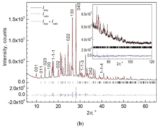 The atomic coordinates in the Rietveld fitting were not refined. In addition to the unit cell parameters, from the structure parameters, only the isotropic temperature factors of atoms were refined. The values of the overall temperature factors Bisoov were refined for each atom sort. The estimated standard deviations (e.s.d.s) calculated in Rietveld programs are usually underestimated due to serial correlations between adjacent data points. Verification of the presence of serial correlations and calculation of the coefficient me.s.d., correcting by multiplication the standard deviations obtained in TOPAS, were performed using the program RietEsd [57], written on the basis of the procedure from Ref. [58]. The drawings of the structure were made using the Vesta program [59]. Further details of the XRD experiment, WHP XRD line analysis and Rietveld refinement are the same as published elsewhere [60,61].