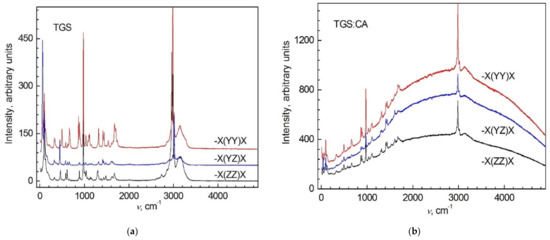 The polarized Raman spectra of TGS:CA crystals consist of a large number of lines almost identical to those observed in nominally pure TGS. The manifestation of these lines is associated with molecular vibrations in the molecules of glycine and sulfuric acid (see Table 7). Doping of TGS crystals with CA leads to the loss of translational symmetry in TGS:CA solid solutions. For this reason, one would expect a noticeable broadening of the lines in TGS:CA Raman spectrum [66]. However, no significant difference in line widths in Figure 5a,b is observed. Thus, a spatial disorder intrinsic to solid solutions does not significantly affect the Raman spectrum of TGS:CA crystals. It should be noted that the Raman scattering lines in TGS:CA are observed against the background of luminescence, which manifests itself in a wide spectral region and is absent in pure TGS.