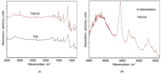 Comparison of FTIR absorption spectra of TGS:CA (90:10) and pure TGS in the spectral range of 800–3500 cm−1 are presented in Figure 6a. Most of lines observed in the TGS:CA crystal correspond well to those in pure TGS [13,15,19,25,32,33]. Figure 6b shows absorption spectrum of TGS:CA for ν = 4000–4800 cm−1. Table 7 lists the lines observed in the Raman and FTIR spectra of TGS and TGS:CA crystals and their interpretation.