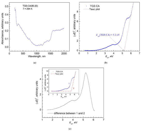 The presence of the additional absorption in the TGS:CA spectrum can be associated with electronic transitions involving defects in the TGS lattice induced by the introduction of CA molecules into TGS. The contribution of these transitions to the absorption spectrum can be estimated as the difference between the absorption spectrum of TGS:CA (line 1 in the inset in Figure 7c) and the fragment of its fundamental absorption spectrum modeled by the Tauc plot (line 2 in the inset in Figure 7c). The absorption spectrum thus obtained is shown in Figure 7c. It includes at least two absorption bands with maxima at ~5.2 and ~3.9 eV. The absorption band at ~5.2 eV can presumably be associated with the creation of excitons localized at the lattice defects, including impurity CA molecules or neighboring TGS ones.