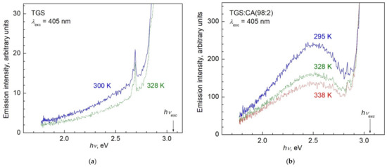 Under 405 nm laser excitation the emission spectrum of pure TGS represents factually a fragment of the long-wavelength wing of the aforesaid emission band (Figure 8). The narrow line in Figure 8 is attributed to Raman scattering of light in the TGS crystal with the participation of the CH2 valence mode [64] (see also Table 7). So, the PL intensity is small and comparable to that of Raman lines.
