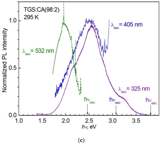 PL spectra of (a) TGS and (b) TGS:CA (98:2) crystal under 405 nm (Eph = 3.06 eV) laser excitation at different temperatures (specified in the figure). (c) Normalized PL intensity of TGS:CA (98:2) crystal at a temperature of 295 K for excitation at λexc ≈ 532 nm, 405 nm and 325 nm.
