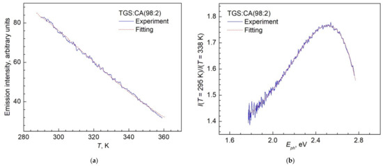 Figure 7a presents the UV-near IR absorption spectrum for TGS:CA (80:20) crystal. The doping of TGS with croconic acid is accompanied by the appearance of absorption in the transparent region of pure TGS. This absorption manifests itself in the form of a structured long-wavelength tail adjacent to the edge of the fundamental absorption of TGS, as well as an absorption in the IR region at λ = 1550–2000 nm. The traits of the absorption are clearly seen when considering the absorption in Tauc coordinates (αEph)2, Eph (Figure 7b) (where α is the absorption coefficient of the crystal). The shortest wavelength part of the absorption spectrum in region Eph = (6.0–6.2) eV in Figure 7b is well approximated by the linear dependence (solid black line), which can be regarded as the Tauc plot related to direct allowed interband transitions in crystals. The Tauc plot yields an estimation of the value of the optical bandgap as 5.2 eV, which is close to the Eg value in pure TGS (~5.2–5.6 eV [21,33]).