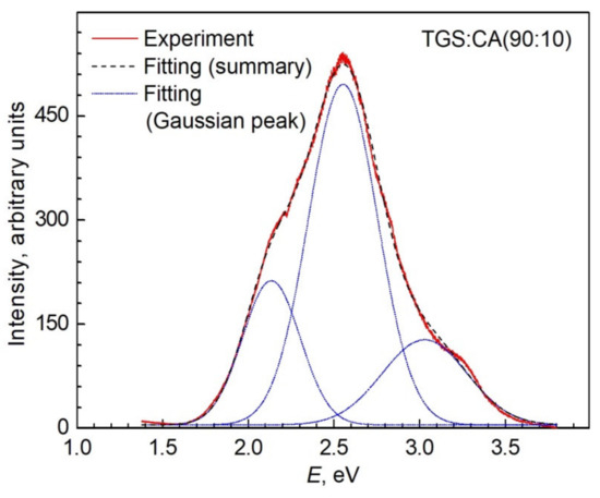 PL spectrum of the TGS:CA (90:10) crystal upon excitation with λexc = 325 nm (Eexcph = 3.81 eV). The decomposition of the PL contour into three Gaussians with maxima at Eph = 2.13 eV, 2.55 eV, and 3.03 eV is shown.