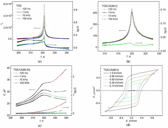 In TGS crystals, in the vicinity of the P21/m (11) → P21 (4) ferroelectric phase transition at the Curie temperature Tc ≈ 49 °C, the permittivity εb obeys the Curie–Weiss law (at T > Tc εb = C/(T–Tc), C ~ l03 K, εbmax ~ l03–l05) [3,13]. The temperature dependences of permittivity and dissipation tangent tg(δ) at various frequencies in the TGS crystals used in our work are shown in Figure 11a. The value of εbmax reaches ~ 6000. The value of spontaneous polarization at RT in these crystals is Ps ~ 2.8 C/cm2. As shown by numerous studies of the effect of various inorganic and organic impurities on the ferroelectric and pyroelectric properties of TGS crystals, the introduction of impurities usually leads to a decrease in switchable spontaneous polarization, an increase in the coercive field, and a decrease in the permittivity and losses, but can lead to an increase in the pyroelectric coefficient [3,13].