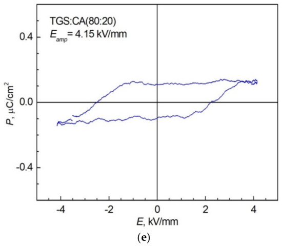 Figure 11c,e show the temperature dependence of the capacitance C, and the dielectric hysteresis loop in the TGS:CA (80:20) film, measured using an interdigital electrode system. An increase in the CA concentration leads to a strong broadening of the dielectric anomaly, a decrease in their amplitude, a decrease in switchable polarization, and a strong increase in the coercive field. Note that in polycrystalline films of pure TGS, prepared in the same way [70,71] such broadening has not been observed. The most likely reason for such a strong change in the dielectric properties is the appearance in TGC:CA film of internal random electric fields caused by the presence of CA molecules. Another reason may be concerned with film nonuniformity. In Figure 1f we clearly see the presence in the TGS:CA (80:20) film of blocks of a different color. This indicates the presence of non-uniformity caused by a spread of CA molecules concentration in blocks. Nevertheless, it can be argued that an increase in the concentration of CA molecules leads to an increase in the smearing of the transition, a decrease in the switchable polarization, and an increase in the coercive field.