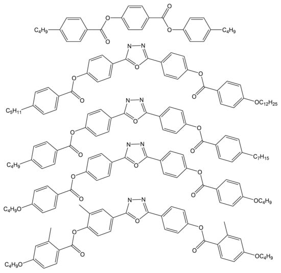 Structures of the five mesogens used in Table 1 (top to bottom: 1,3-benzenedicarboxylic acid,1,3-bis(4-butylphenyl)-ester, C5-Ph-ODBP-Ph-OC12, C4-Ph-ODBP-Ph-C7, C4O-Ph-ODBP, and C4O-Ph-ODBP (trimethylated)).
