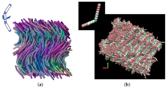 (a): Snapshot from a simulation of a simple coarse-grained simulation model of jointed spherocylinders. 1728 molecules are used with each molecule composed of three bonded spherocylinders interacting through the soft spherocylinder model of Lintuvuori and Wilson [,]. The angle between adjacent spherocylinders is set at 150 degrees. A torsional potential about the central spherocylinder is used to control the orientation of the two arms to impose an average planar conformation corresponding to a typical bent-core mesogen. The snapshot shows a phase that arises spontaneously on cooling from a higher temperature nematic phase. (b): Twisted layer structures arising from simulations of 10,000 chiral-rigid-asymmetric-bent-core molecules. Green and white spheres represent a central aromatic core and interact through a Lennard–Jones potential with , the pink spheres interact through a WCA potential with . The two arms are positioned at an angle of 120 degrees.
