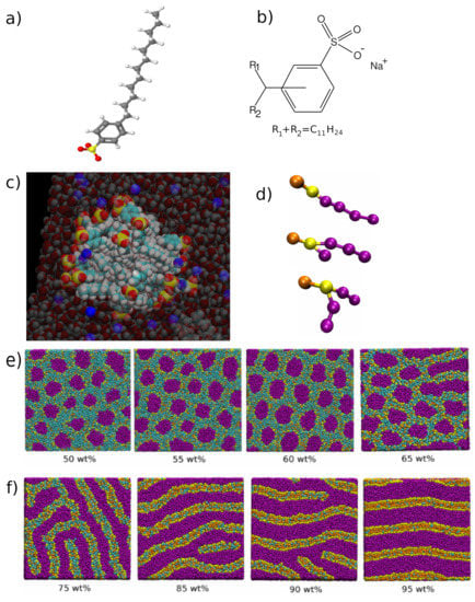 Structures and simulation models for versions of LAS (linear alkylbenzene sulfonates). (a) Molecular structure of a fully linear single chained version of the anionic surfactant LAS; (b) chemical structure of typical branched LAS molecules used in industry, (c) single micelle of LAS in water (sulfonate head groups are shown in yellow and red, and blue sites represent sodium counter ions, water molecules are shown in a partially transparent representation); (d) three DPD models of LAS with the orange bead representing the sulfonate head group, the yellow bead representing the phenyl group, and the purple beads representing parts of the alkyl chain; (e,f) simulations snapshots from the phase diagram of the linear form of LAS adapted with permission from Ref. [], 2018, Sarah J. Gray; showing (e) the hexagonal phase composed of cylindrical micelles and (f) the lamellar phase.