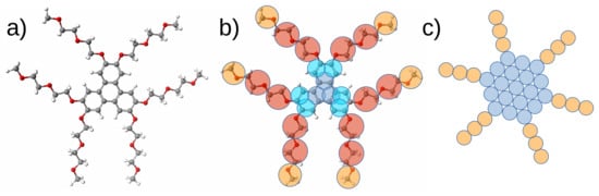 It is also interesting to ask whether an “in-between” coarse-grained model can provide further insights into the behaviour of TP6EO2M. This was the aim of recent work by Potter, Wilson, and co-workers who explored a MARTINI-style coarse-grained model (Figure 8b) where sites are grouped into beads representing two or three heavy atoms plus attached hydrogen atoms [,]. Such models are quite interesting as they aim to capture the individual interactions responsible for local order but also aim to capture the thermodynamics and correct self-assembly and self-organisation over larger length scales. They aim to perform this while also hitting a “sweet spot” where they employ only a fraction of the simulation time of an atomistic model, saving CPU cycles through a reduced number of sites, long dynamic time steps, and a speed-up in phase space exploration. While the idea of such a “Goldilocks” model is very appealing and has also many potential uses in related fields such as polymer simulation, membrane studies [,,,,,,] and protein simulation, the challenges of making such a model are quite demanding. In fact, the very act of coarse-graining in an aqueous system alters the balance between entropy and enthalpy. The hydrophobic interaction in coarse-grained models of chromonics must incorporate additional enthalpic contributions to the free energy to make up for the loss of entropic ones.
