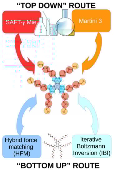 There are a range of methods available to generate an intermediate coarse-grained model for a molecule such as TP6EO2M using both “bottom-up” and “top-down” routes [], i.e., starting from an atomistic reference simulation, or starting from experimental structural and thermodynamic data (see the diagram in Figure 9).