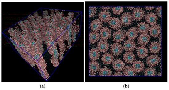- The coarse-grained regime where simulations can be used to study the structure of smectics [], twist grain boundary phases [], and polymer liquid crystals [,,,] and more complex liquid crystal phases where molecular shape and packing (or often the shape of a larger object such as a colloid) are often significant in determining the structure of the phase;
