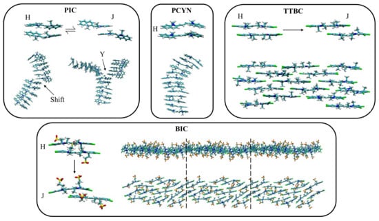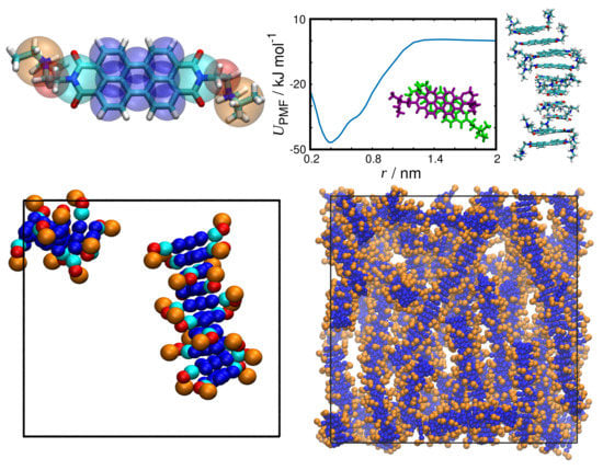 - Yu, G.; Walker, M.; Wilson, M.R. Atomistic simulation studies of ionic cyanine dyes: Self-assembly and aggregate formation in aqueous solution. Phys. Chem. Chem. Phys. 2021, 23, 6408–6421. [Google Scholar] [CrossRef]